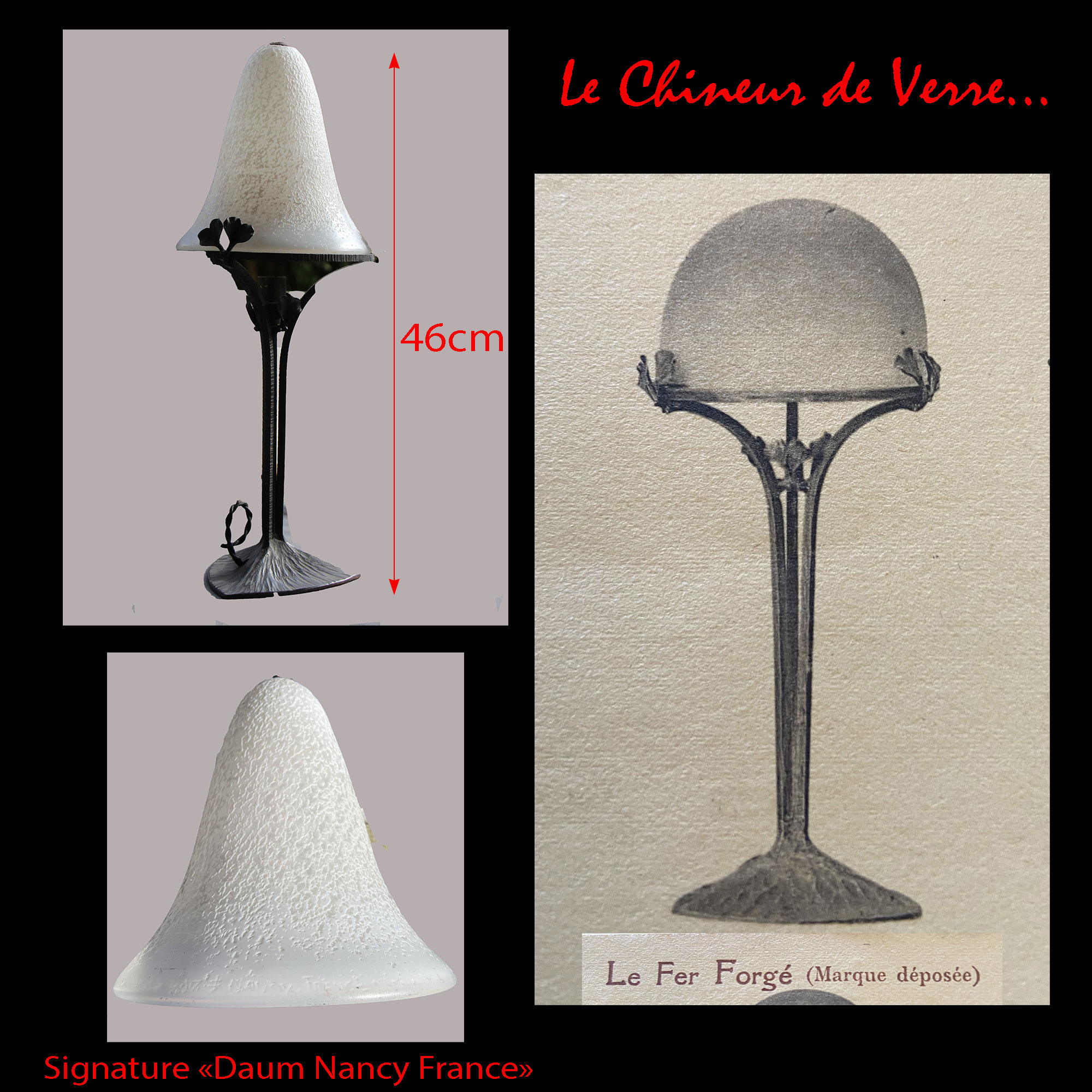Le pied tripode de grande qualité à décor de feuilles de ginkgo biloba est signé « le fer forgé » comme tous les modèles réalisés par cet artiste qui a conçu entre-autres beaucoup de pieds de lampe pour les verriers tels que Muller Frères, Schneider ou les frères Daum.