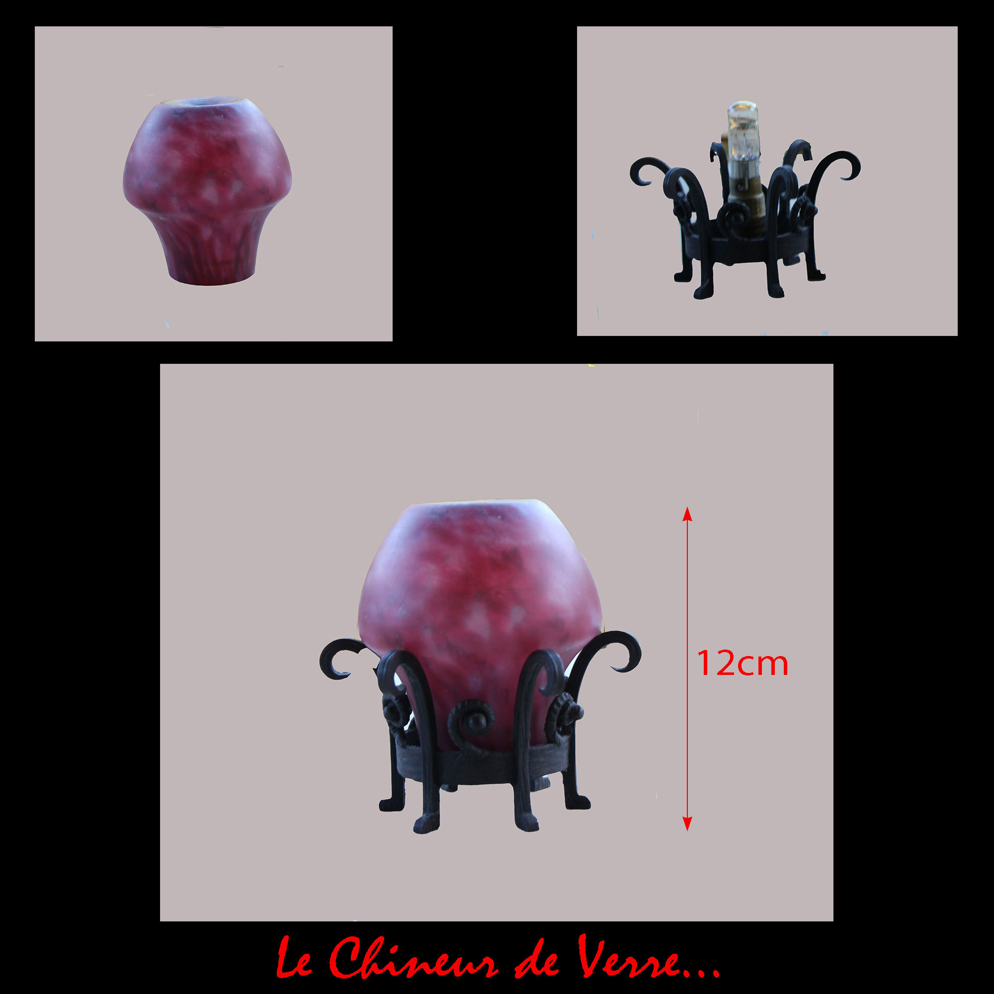 Jolie veilleuse brûle parfum composée d’un verre dans les tons violine, reposant dans une belle monture d’origine en fer forgé. La partie haute du verre présente un petit creux qui servait à déposer quelques gouttes de parfum qui se diffusait grâce à la chaleur de la petite ampoule lorsqu’elle était allumée.