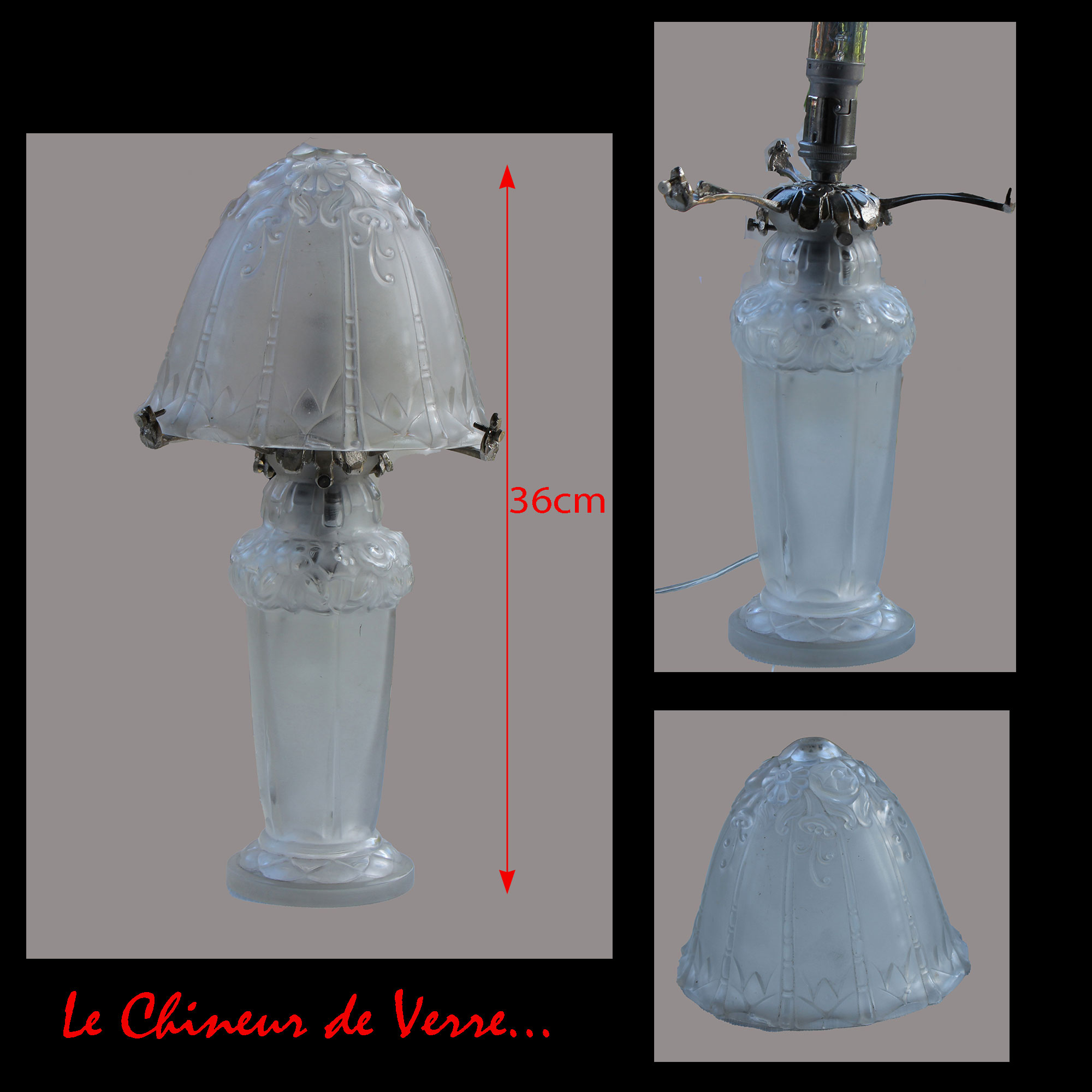 Cette lampe à décor de fleurs stylisées est composée d’un très bel obus et d’un pied en verre au même décor.