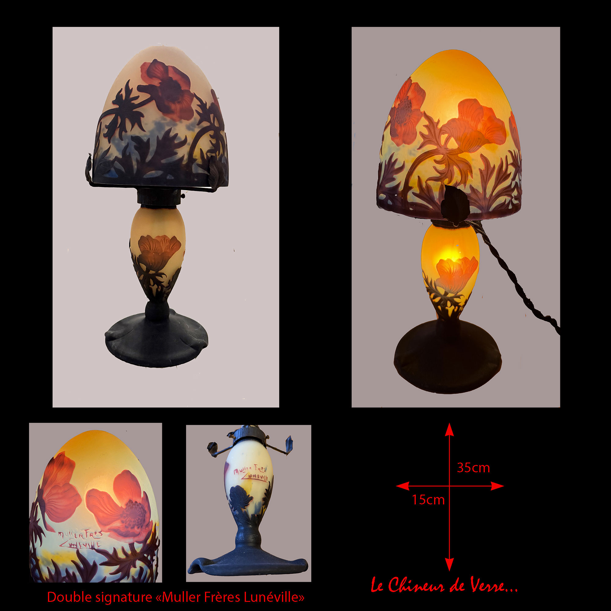 Rare et superbe lampe à poser réalisée par les Frères Muller en verre multicouche au décor dégagé à l’acide, traité rouge et noir sur fond jaune nuancé de bleu . Support d’origine du cache-ampoule à trois branches en fer forgé patiné. Le pied balustre ainsi que le dôme sont signés et situés MULLER Frères Lunéville. Hauteur : 35cm.