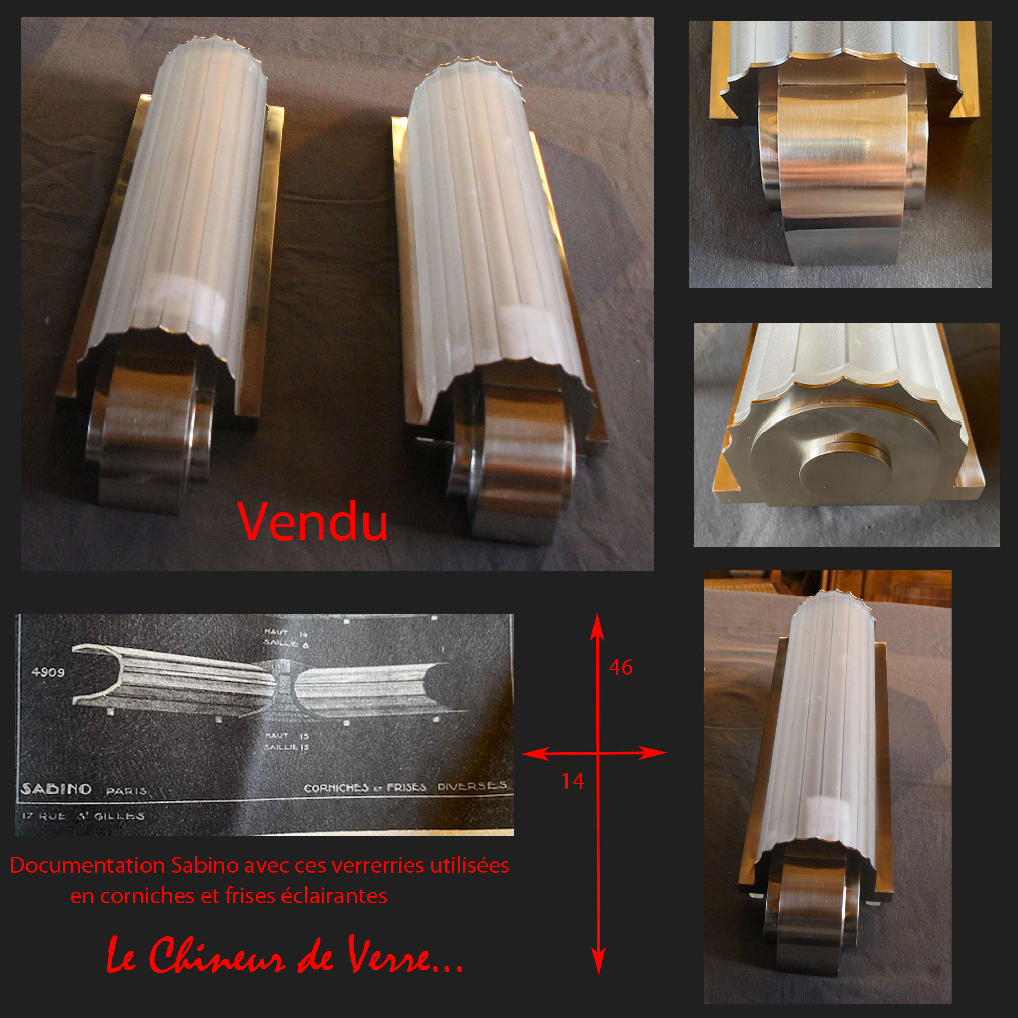Belle suite de cinq grandes appliques Art déco signées Sabino. Décor géométrique très épuré . Elégantes montures en bronze nickelé de grande qualité.